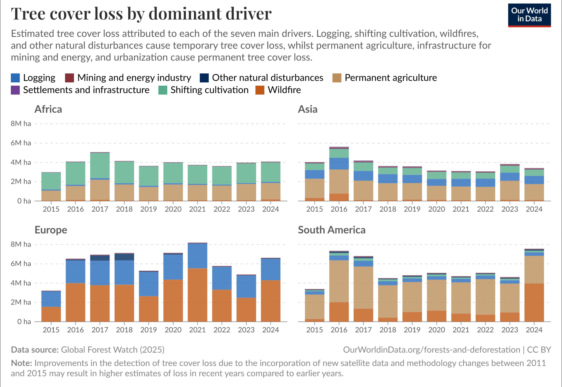 Permanent agriculture and wildfire are the top two reasons behind loss of tree cover globally. While wildfires are the dominant reason in Europe, agriculture is the primary factor everywhere else.