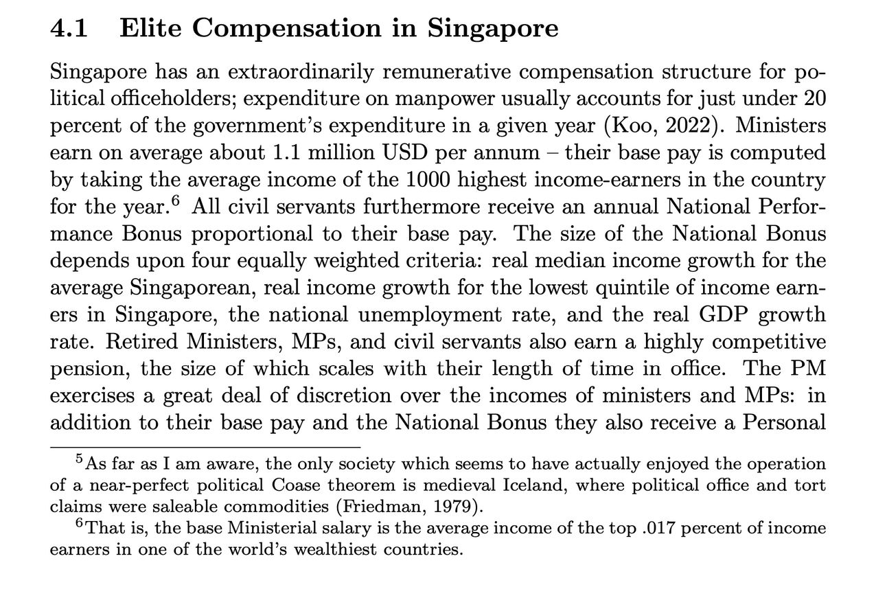 Top pay in the Singaporean government is kind of crazy. Base salary tied to the top 0.02% of earners, and bonuses tied to macroeconomic aggregates.