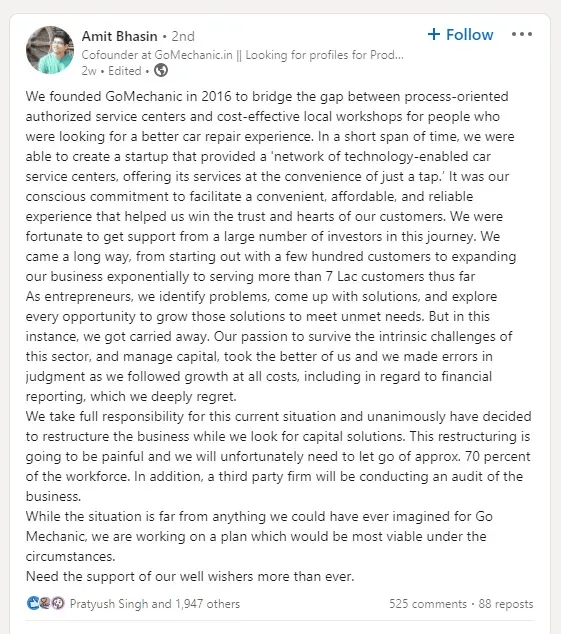 LinkedIn post by Amit Bhasin, one of the Co-founders of GoMechanic, accepting the responsibility of their (wrong)doings...